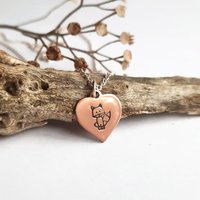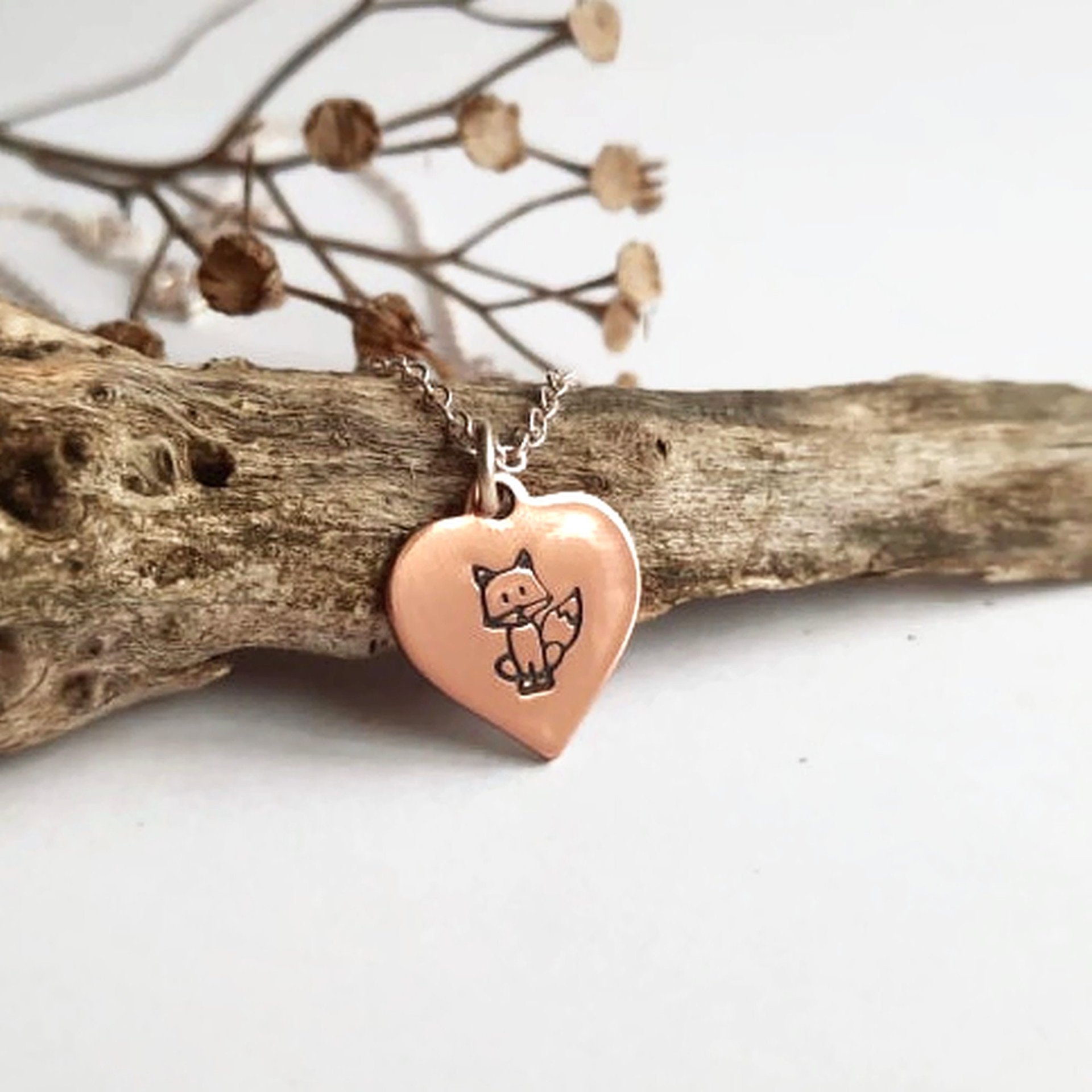 This dainty, pure copper heart pendant is hand stamped with a cute little fox and hangs from a delicate sterling silver chain.