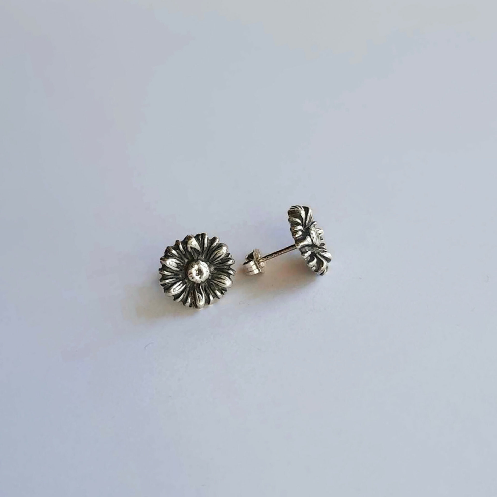 These sweet studs are completely handcrafted by me in pure silver. They are oxidised with a patina to create a distressed, antique finish which highlights all the detail of the flowers.