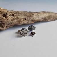The patterned discs are handcrafted from eco-friendly precious metal clay which is kiln fired to create pure 999 fine silver. They are securely soldered onto sterling silver ear posts and oxidised with a patina to highlight all the details.